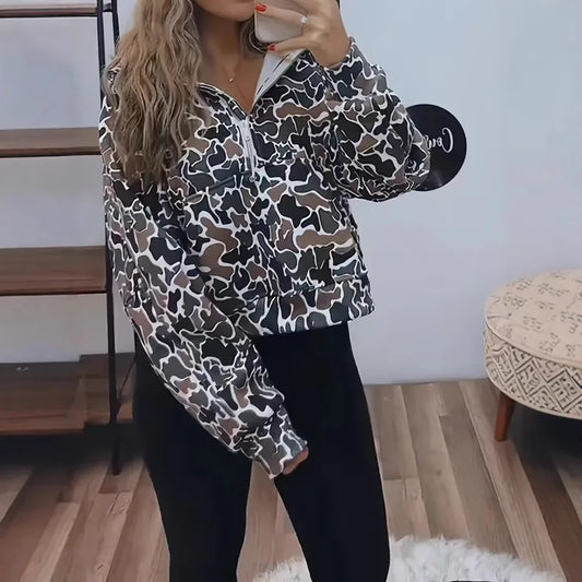 Western Print Sweatshirt Autumn Winter Hunting Print Jacket Women's Loose Fit Long Sleeve Zipper Closure Cotton Polyester Blend Sweatshirt