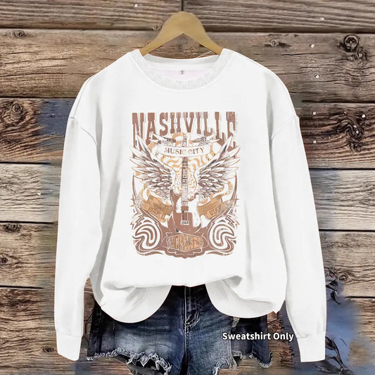 Casual Loose Fitting Round Neck Guitar Wings Print Sweatshirt New Women's Fashionable Street Style Long Sleeve Mid-Length Top