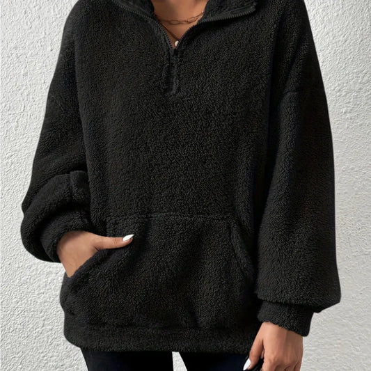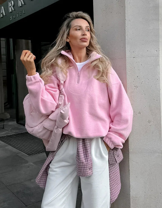 Wish Autumn Winter Plush Fleece Lined Stand Collar Hoodie Women's Casual Top Street Style Loose Fit Long Sleeve Sweatshirt