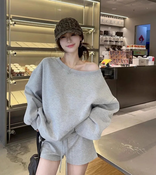 American Lazy Solid Color Shoulder Long Sleeve Hoodie Women Autumn Winter New Small Size Sweet Spicy Shoulder Bared Top