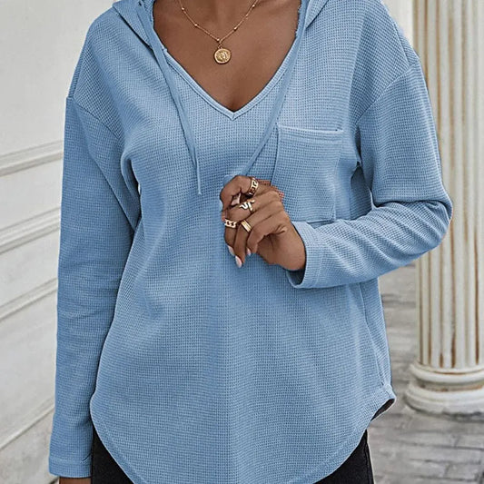 Casual Fashionable Long Sleeve Hooded Plaid T-Shirt European Women's Clothing V-neck Loose Fit Drawstring Elastic Waist