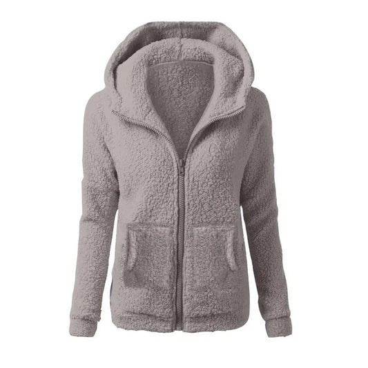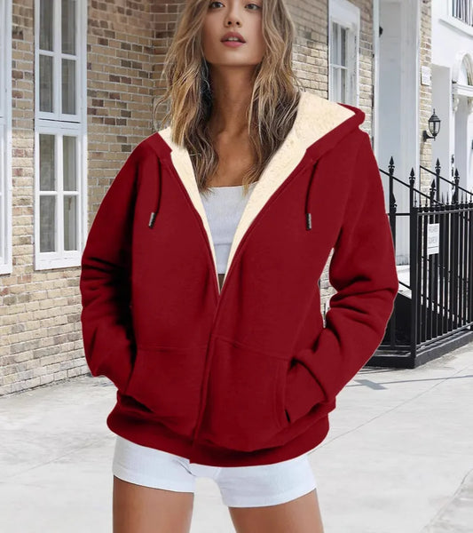 Long Sleeve Fleece Lined Hooded Jacket Loose Street Style Zipper Top Women Solid Color Sweatshirt Casual New Fashion