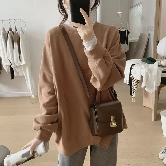 Loose Women's Sweatshirt Round Neck Casual Fleece Long Sleeve Knitted Pearl Leather Autumn Winter Fashion New Style Top