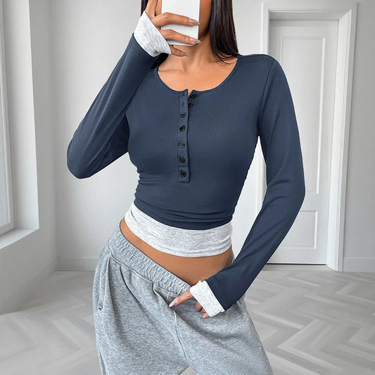 Casual Color Block Long Sleeve Round Neck Top Women's Slim Fit Fake Two-Piece T-Shirt Comfortable Polyester Cool Silk Cotton