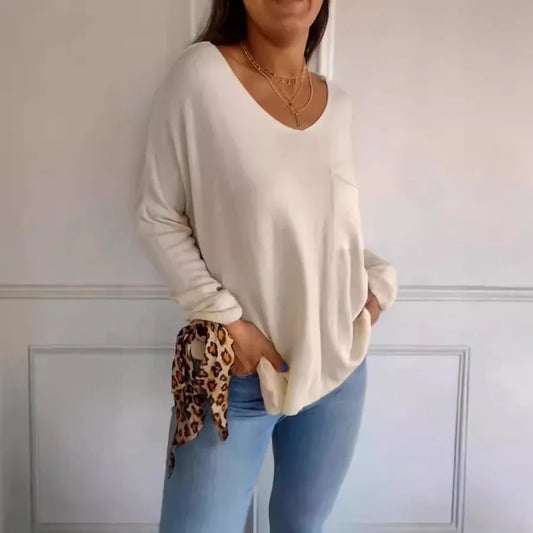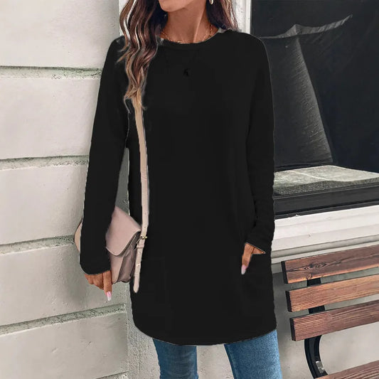 Comfortable Round Neck Long Sleeve T-Shirt Pure Color Women's Fashion Autumn Winter New Style Pocket Design V-Neck Commute Style