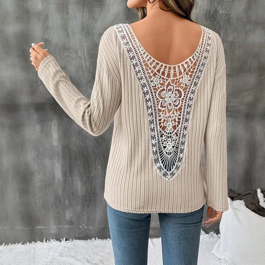 Long Sleeve Lace Backless Knitted T-Shirt Casual Loose Fit Round Neck Women's Fashionable Top Round Neck Pullover New Style