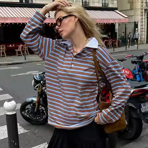Loose Long Sleeve Round Neck Spliced Color Block Women's T-shirt Cotton Polyester Blend Autumn Winter New Style European Fashion Streetwear