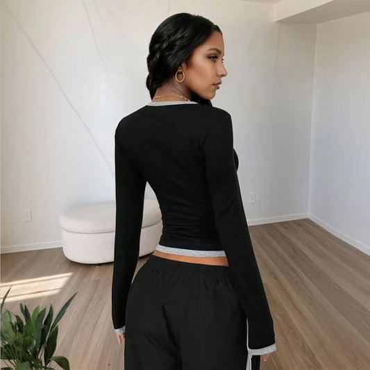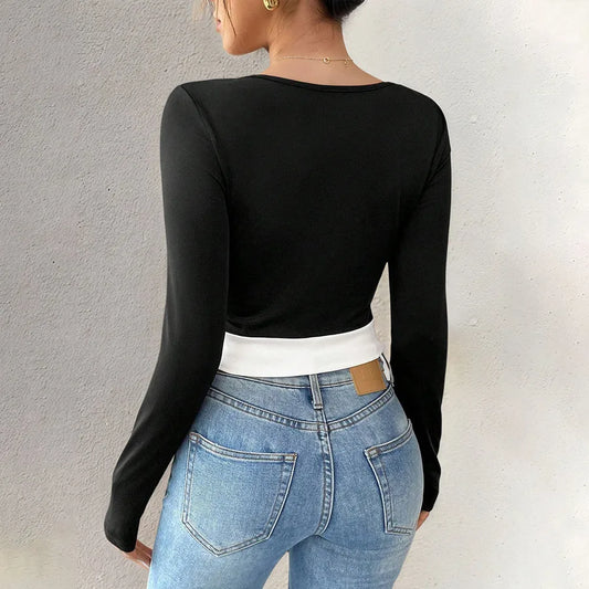 Sexy Spicy Pure Color Women's V-neck Long Sleeve T-shirt Autumn Winter Fashion Contrast Color Patchwork Slim Fit T-shirt