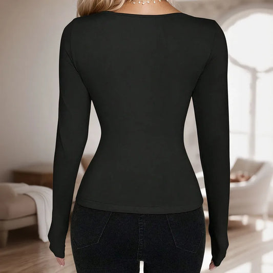 Autumn Winter Long Sleeve Color Block Square Collar Versatile T-Shirt Elegant Top Women's Fashion New Arrival Street Style