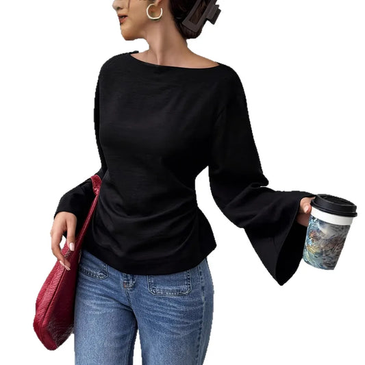 Slim Fit Long Sleeve T-Shirt Women's Autumn Style Bell Sleeve Crew Neck Pure Color American Style Plus Size Casual Top