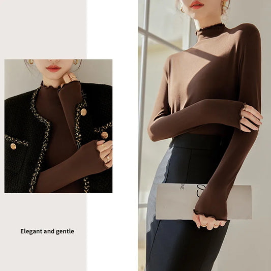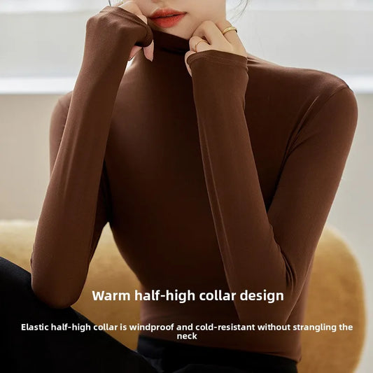 Women's Long Sleeve Base Shirt Half High Collar Slim Fit Inner Wear Face Mask Top Autumn Winter New Style Sweet Fresh Style