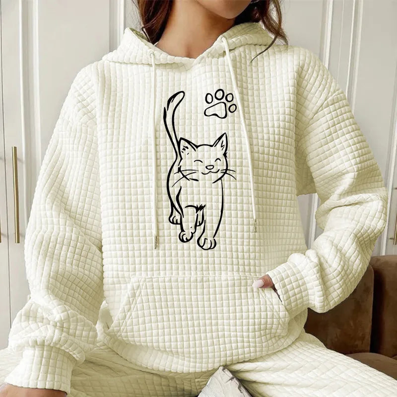Autumn New European Women's Fashion Cat Print Hoodie Sweatshirt Long Sleeve Loose Fit Street Style Polyester Waffle Pattern