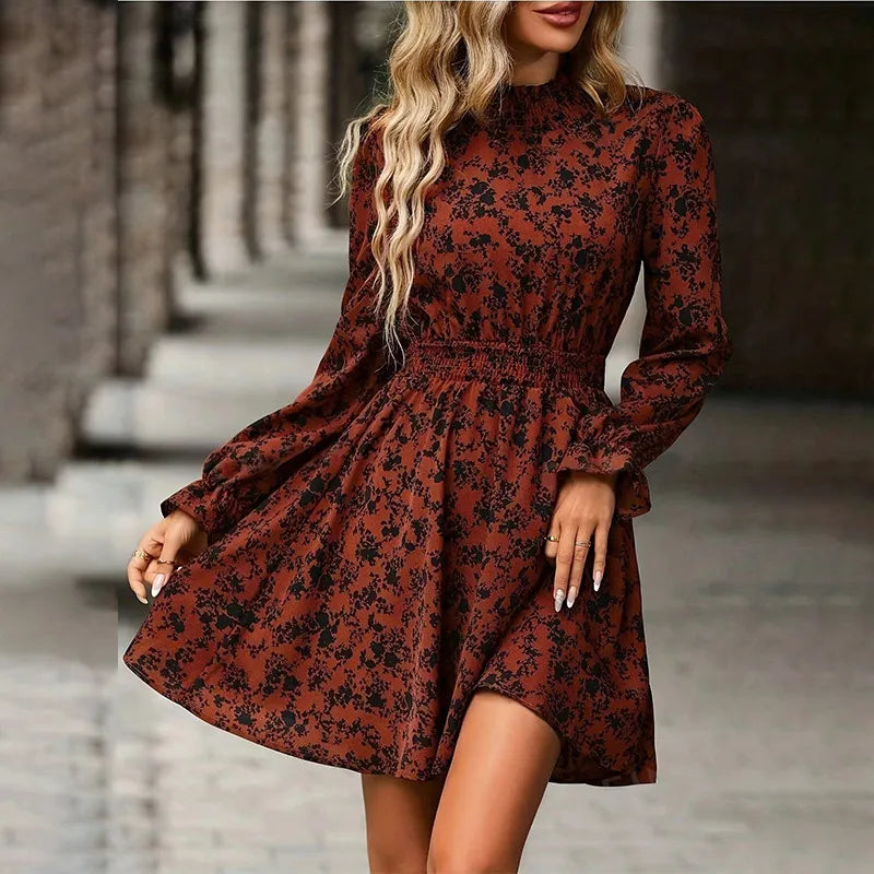 Autumn Winter Women's French Floral Print Slim Fit Long Sleeve Midi Dress Stand Collar Bell Sleeve A-Line Dress Commute Style