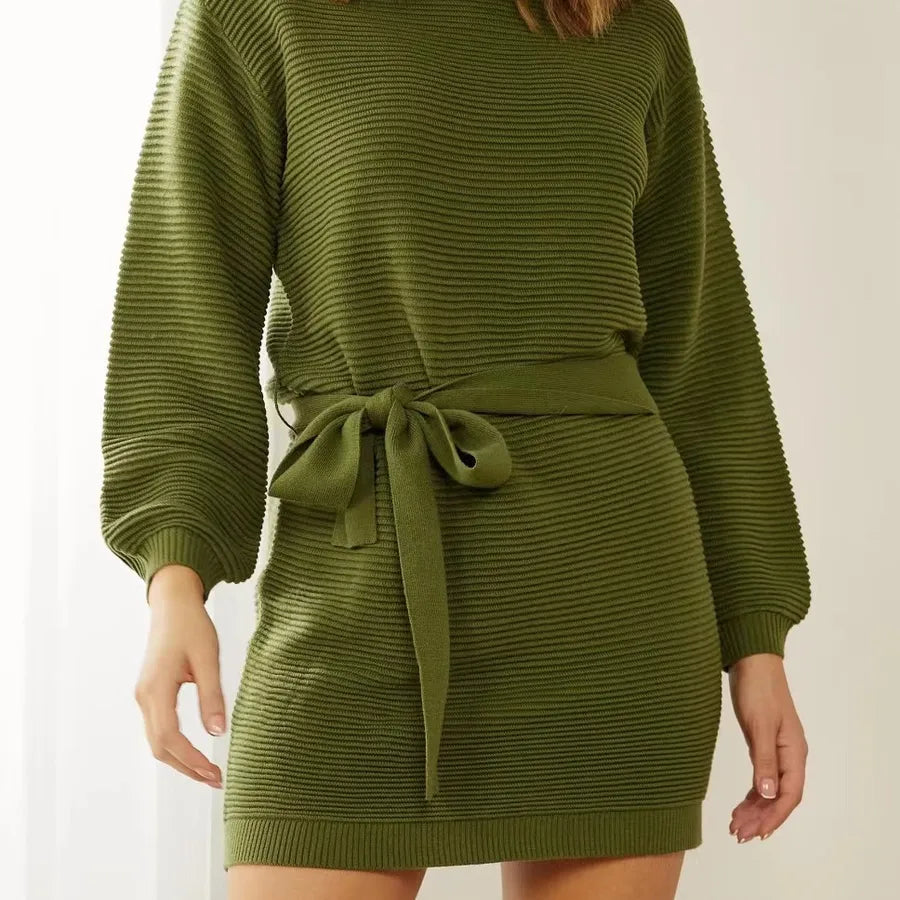 Autumn Winter Women's Long Sleeve Sweater Dress Belted Solid Color Style High Neck Knitted Dress