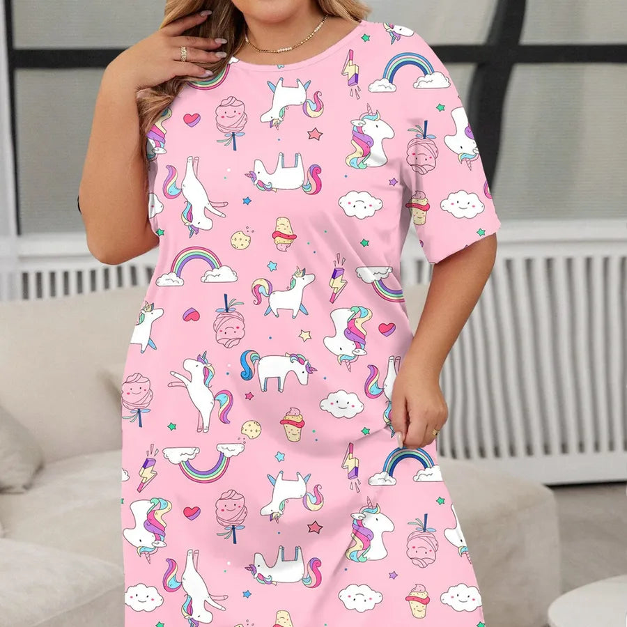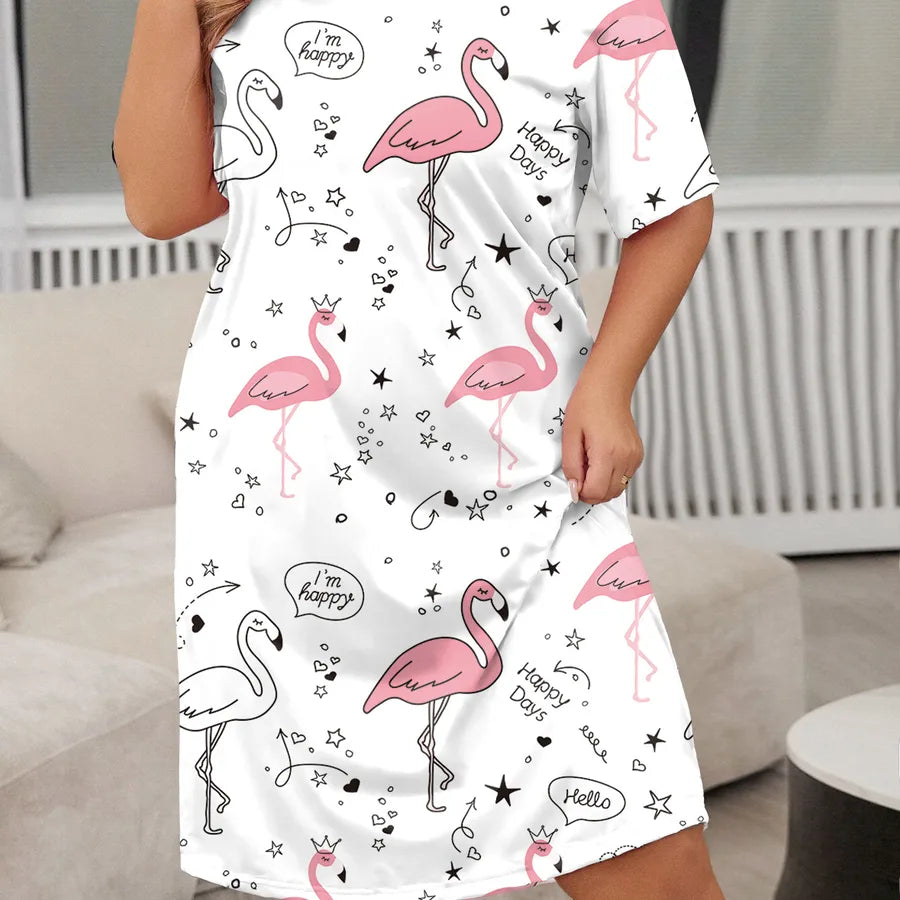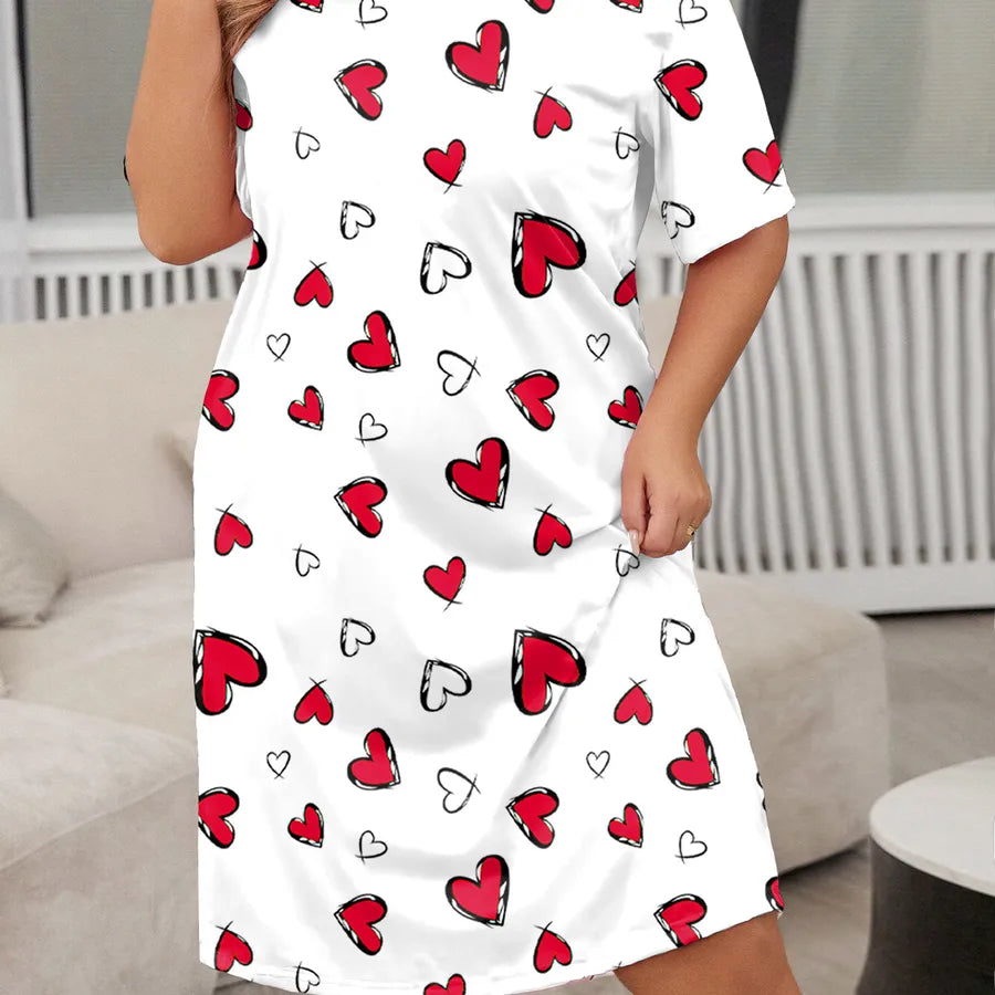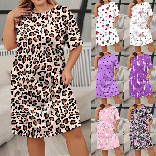 Butterfly Heart Leopard Print Short Sleeve Round Neck Sleep Dress Large Size Midi Polyester Milk Silk Blend Comfortable Nightgown