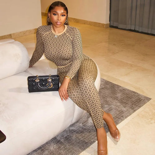 Casual European Style Long Sleeve Romper Women's Slim Fit Elastic Waist Print Neck Round Home Clothes Fashionable One-Piece Suit