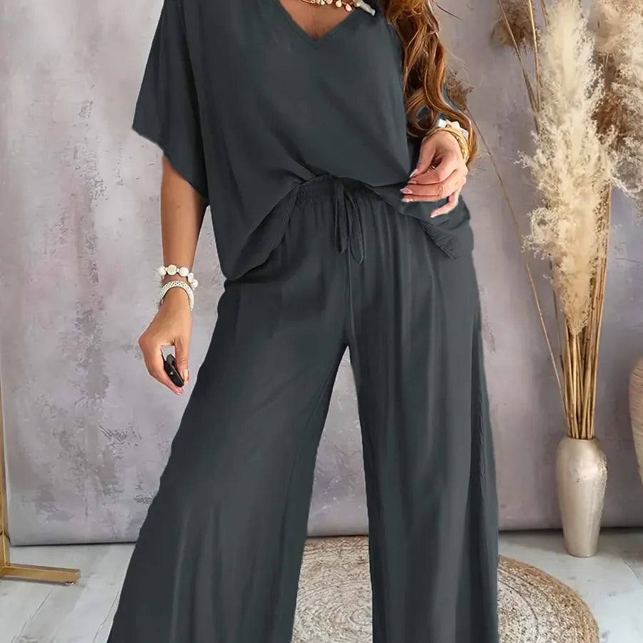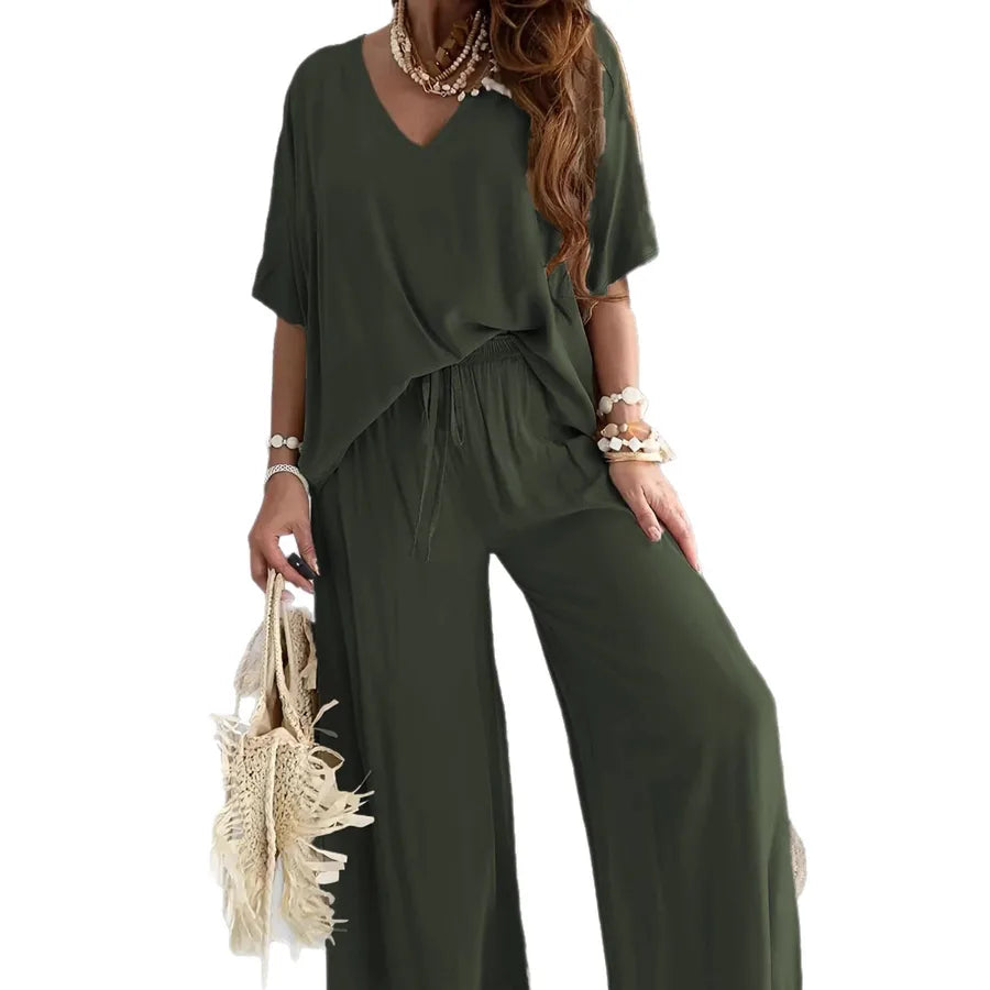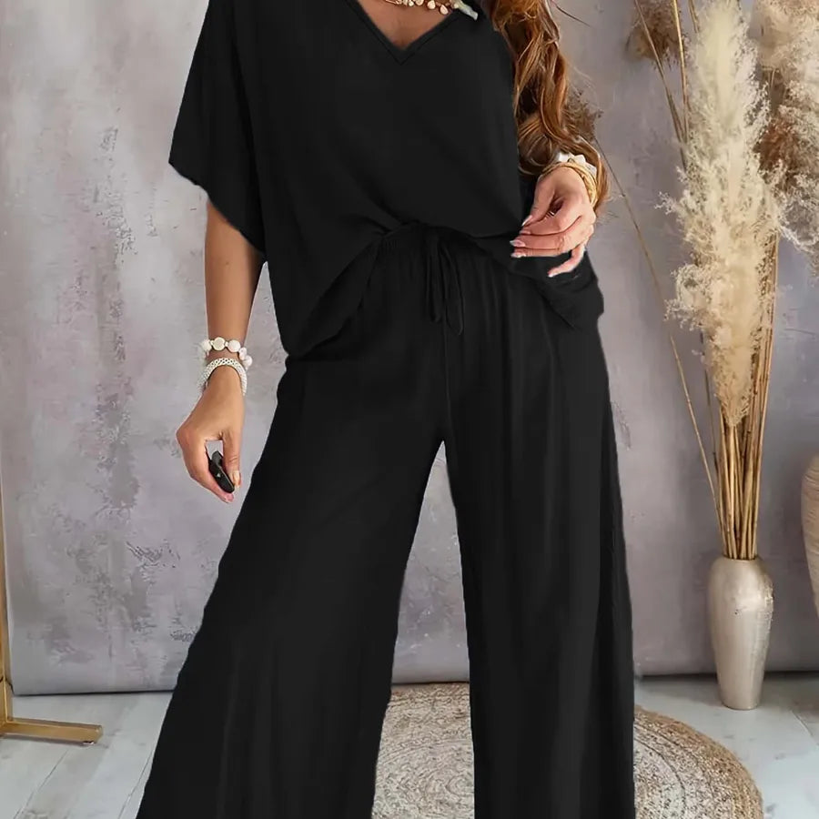 Casual Fashion Loose Batwing Sleeve V Neck Wide Leg Pants Two Piece Set Women's Style Polyester Milk Silk