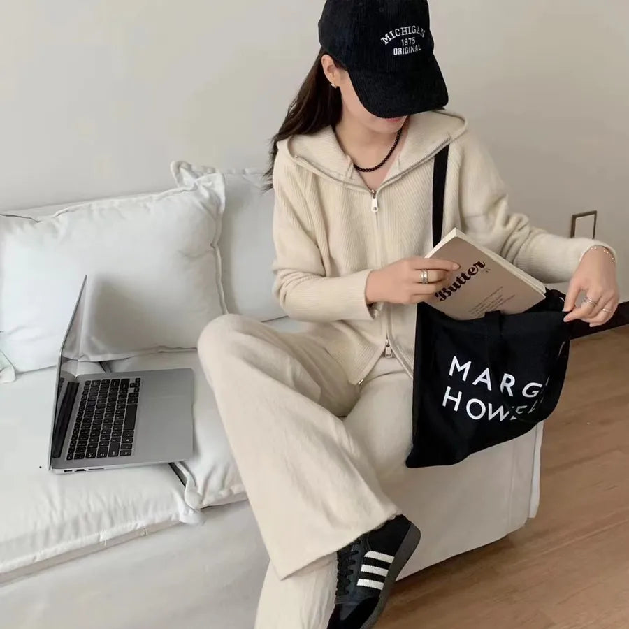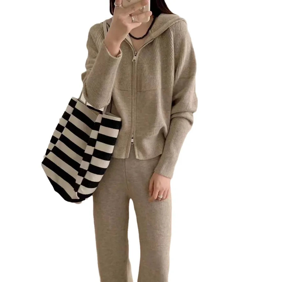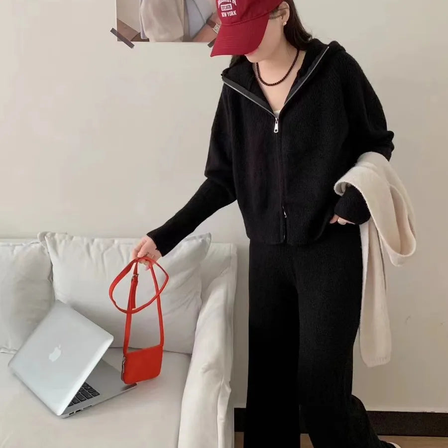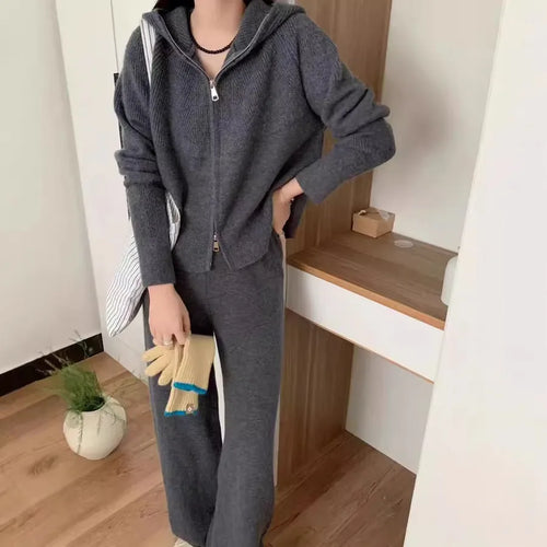 Casual Knitted Hoodie And Wide Leg Pants Set Women's Two Piece Suit Fashionable Autumn Winter New Zipper Open Cardigan Loose Fit