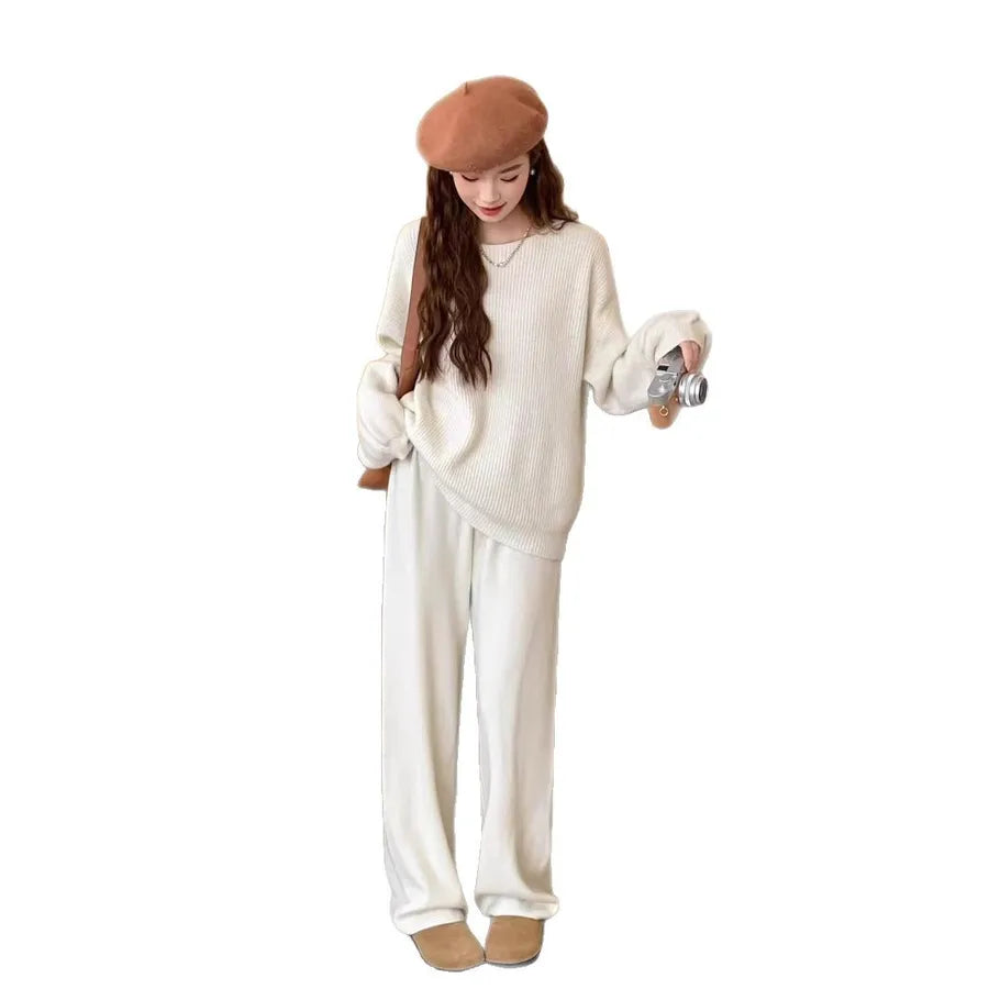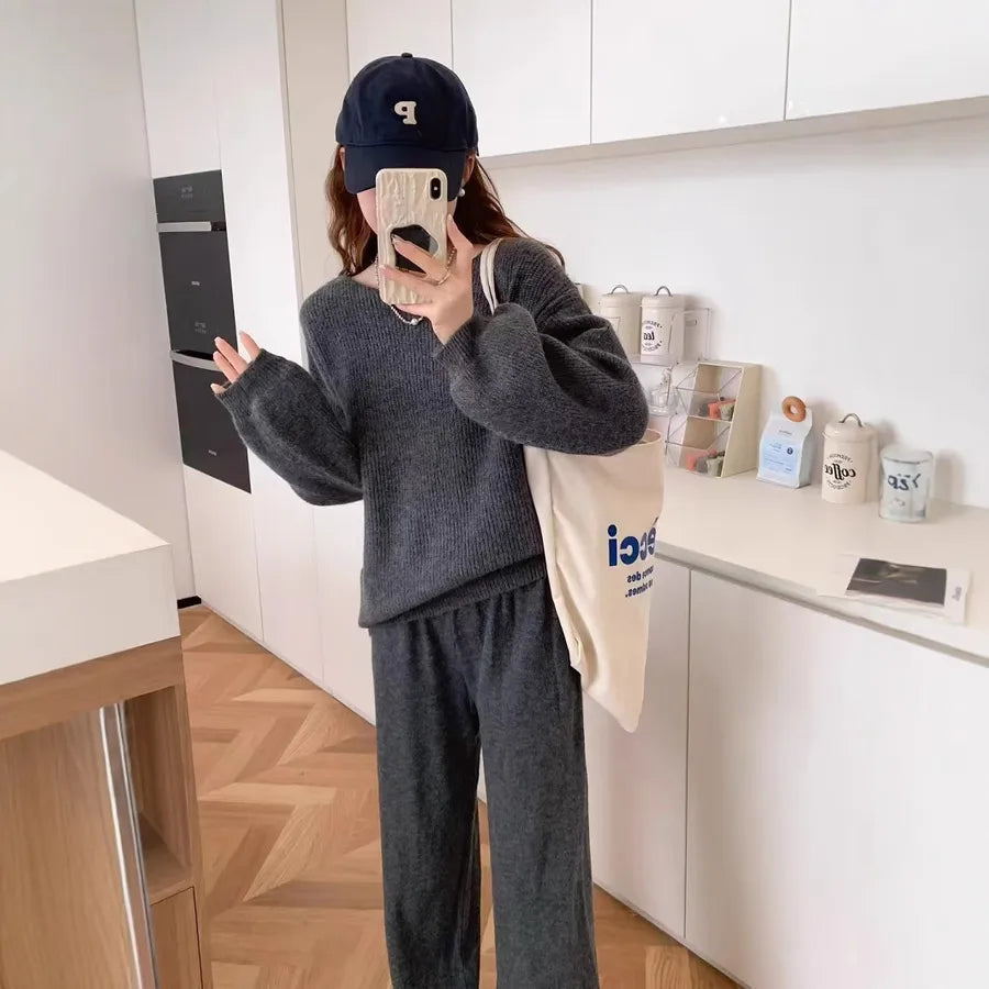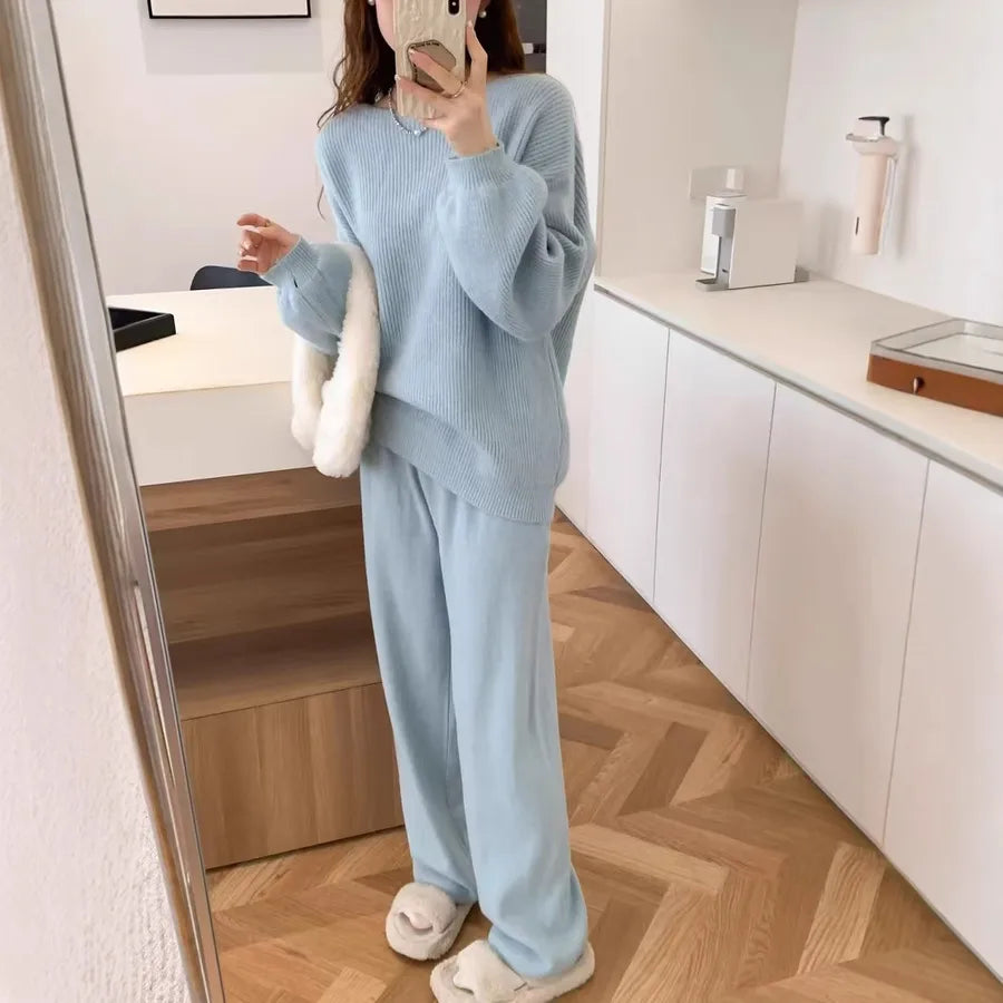Casual Knitted Sweater Set Women Round Neck Pullover Long Sleeve Wide Leg Pants Two Piece Set Comfortable Fashion Commute Style