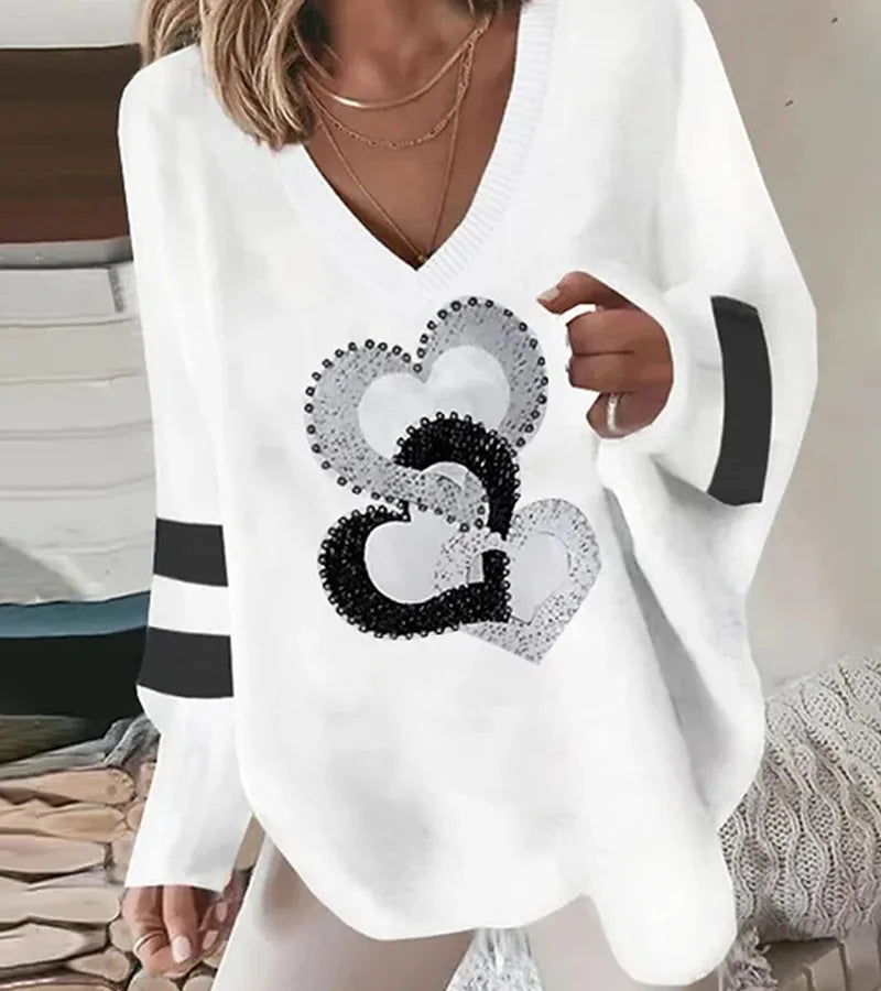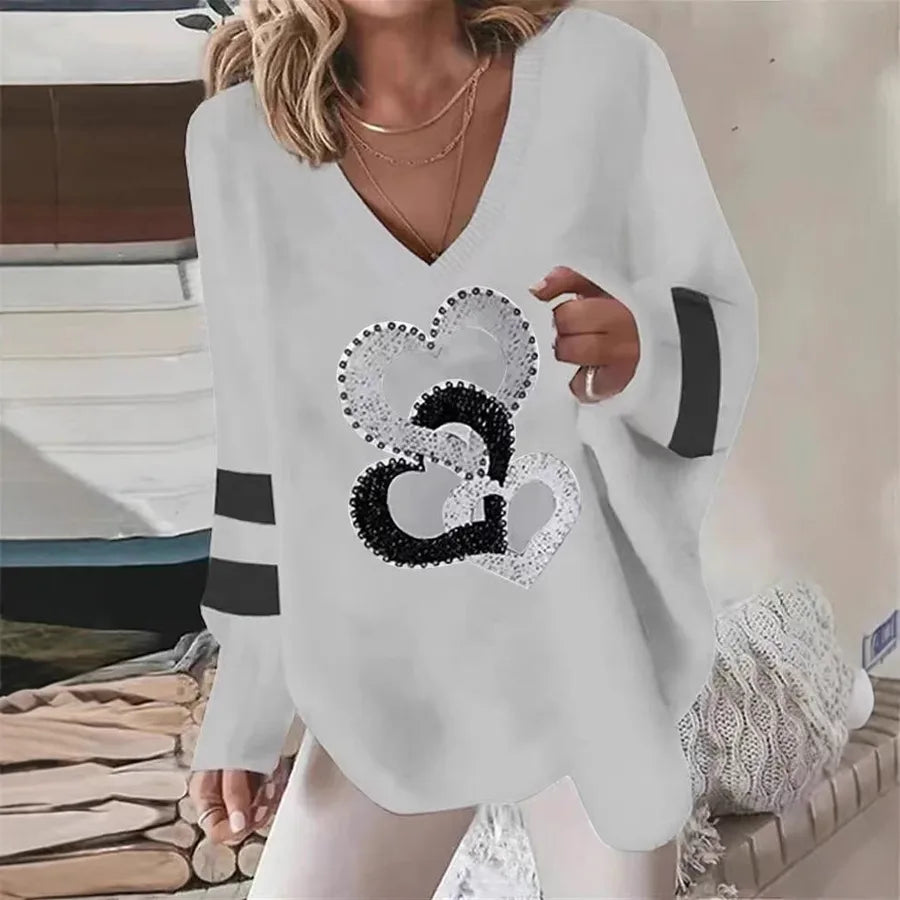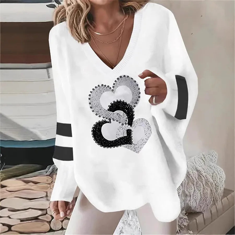 Casual Loose Heart Print Long Sleeve V-Neck Sweatshirt Women's Geometric Patterned Comfortable Fit Mid-Length Polyester Fabric