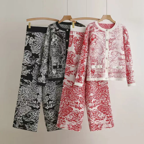 Classic Early Autumn Knitted Long Sleeve Open Cardigan Wide Leg Pants Two Piece Set Craftsmanship Ink Print Elegant Women's Fashion Casual Wear