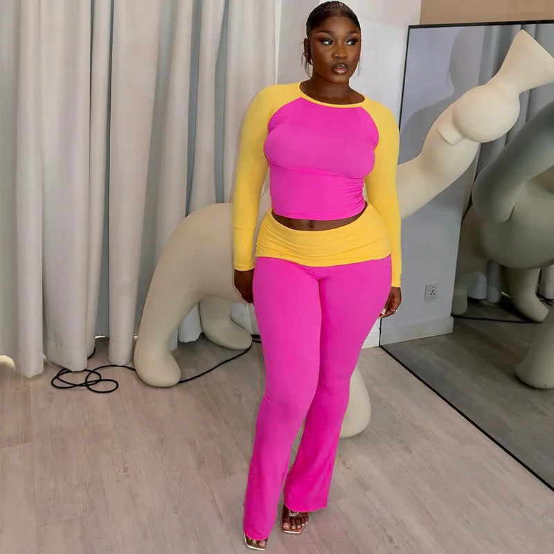 Color Block Long Sleeve Top And Flared Pants Two Piece Set For Women Casual Fashion Outfit European Style Street High Street