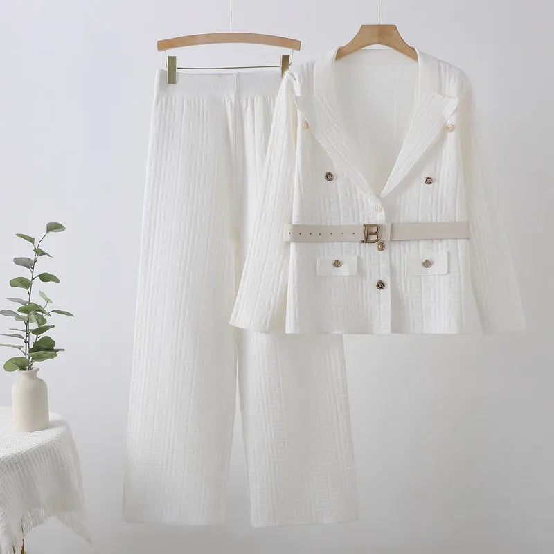 Comfortable Knitted Long Sleeve Long Pants Set For Women With Maze Pattern B-Style Button Collar Waist-Cinching Fashion Casual Outfit