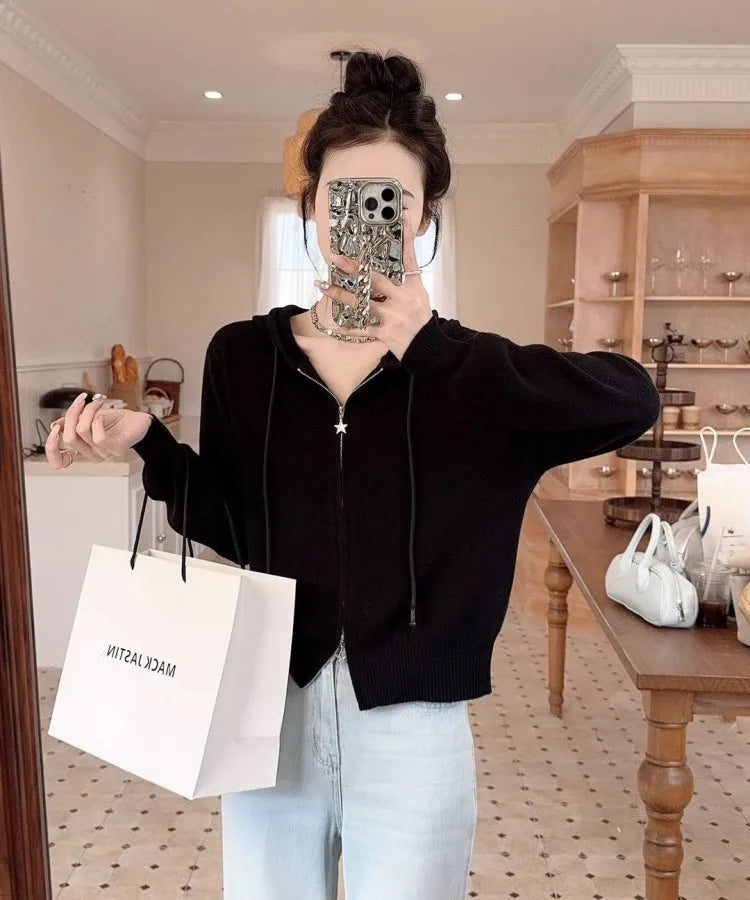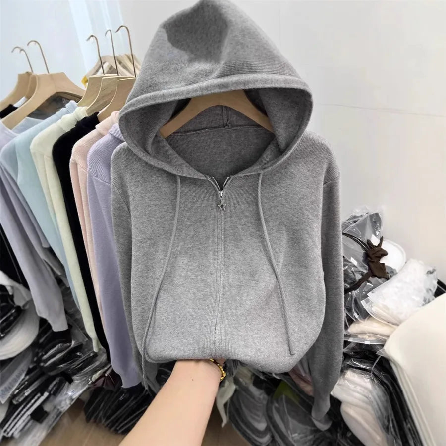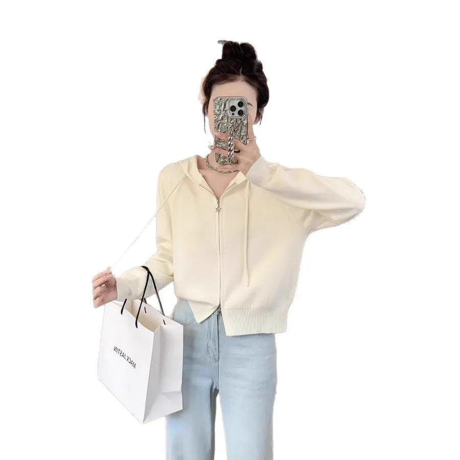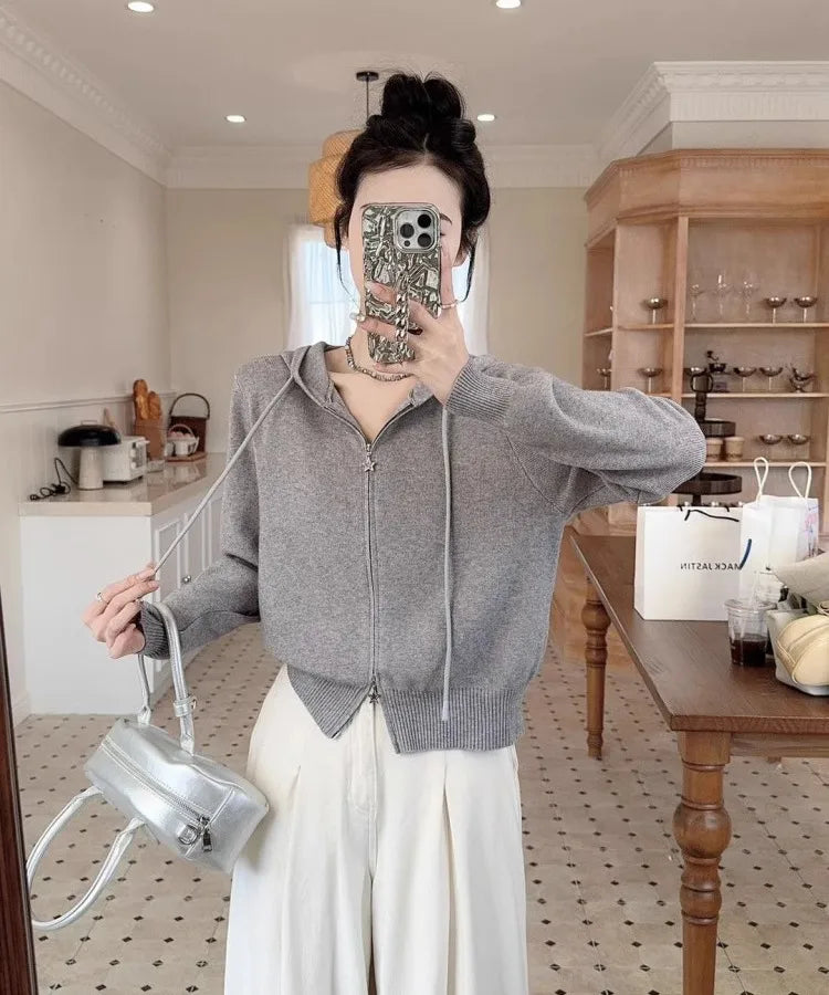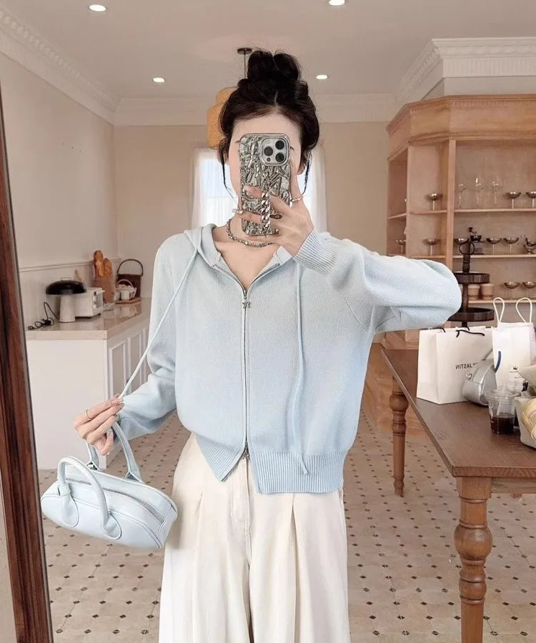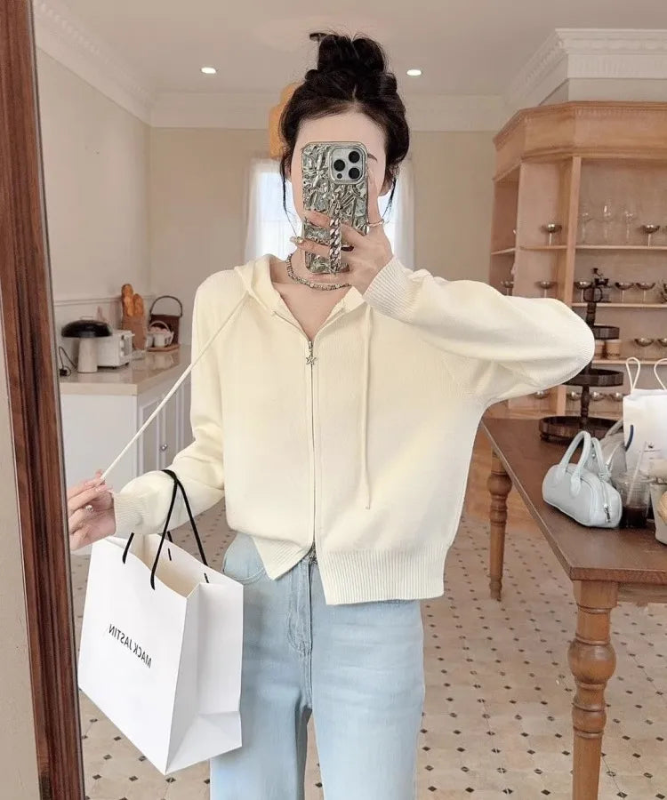Double Zipper Long Sleeve Knitted Cardigan Women's Top Spring Casual Stylish Outerwear Hooded Sweater Fresh Sweet Style
