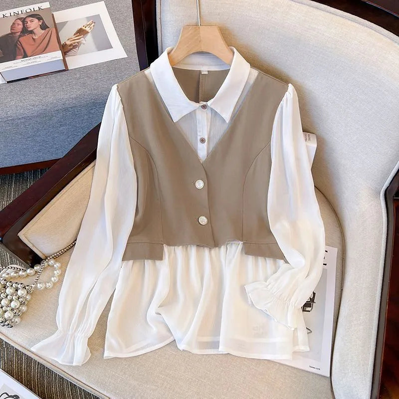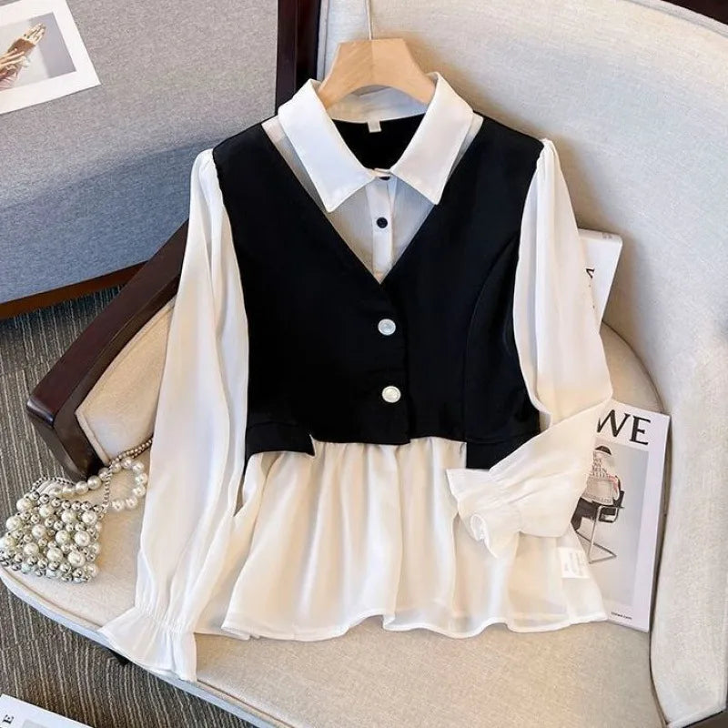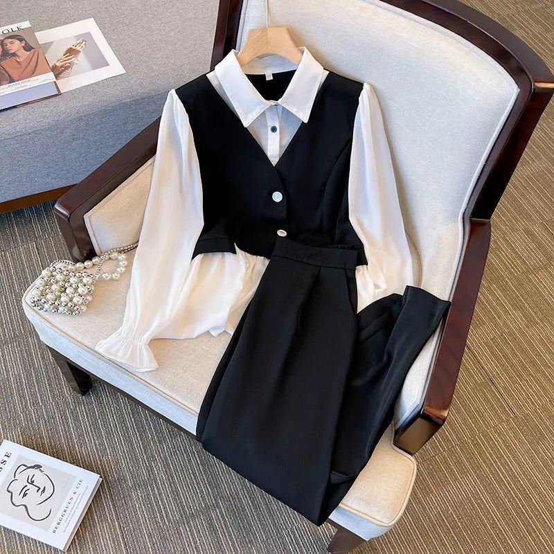 Early Autumn Fashion Set Women's European Goods Atmosphere Youth Slimming Belly Covering False Two-Piece Shirt Casual Two-Piece Set