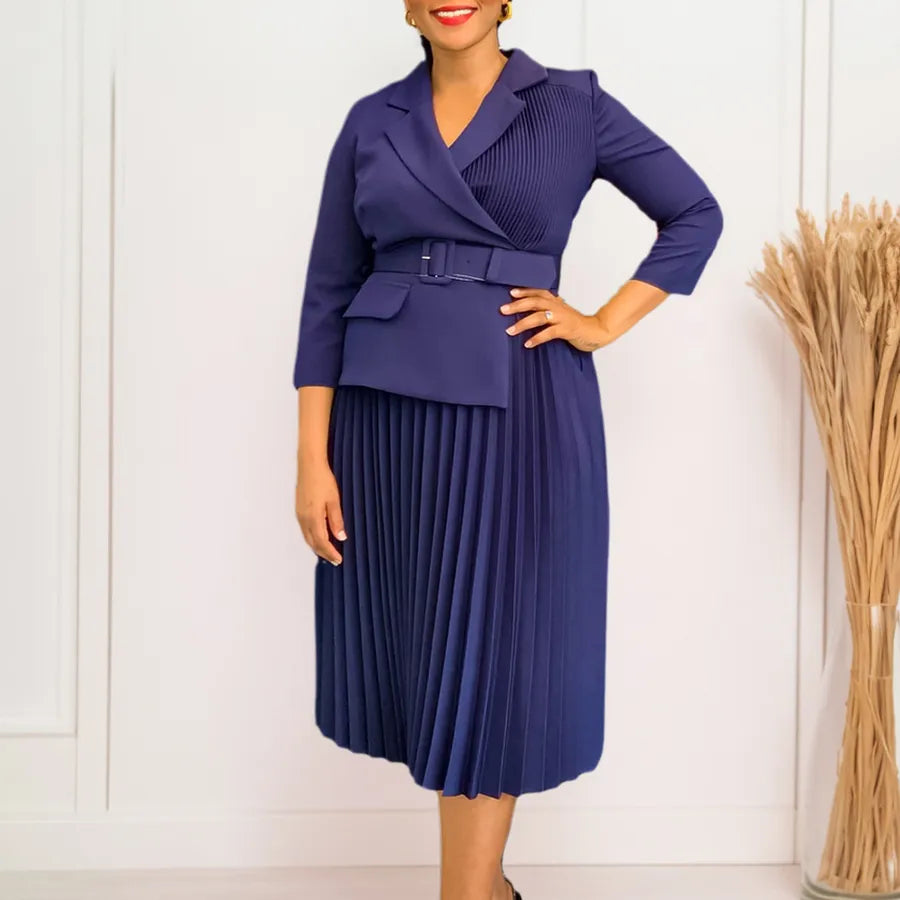 Elegant African Inspired Women's Dress Autumn Winter Suit Collar Pleated Skirt European Style Fashionable Seven Sleeve Dress