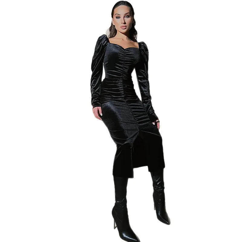 Elegant Autumn Winter New Style Long Sleeve V Neck Pleated Slim Fit Evening Dress Velvet Polyester