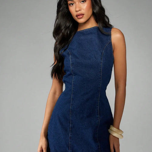 Elegant Back-Tied Women's Denim Dress Style Cotton Blue Round Neck Summer Streetwear Fashion Dress