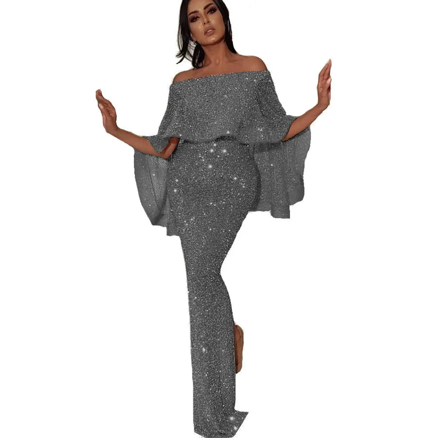 Elegant Backless Gown With Large Pleated Shoulder One Shoulder Dress Blingbling Wrap Chest High Slit Evening Dress