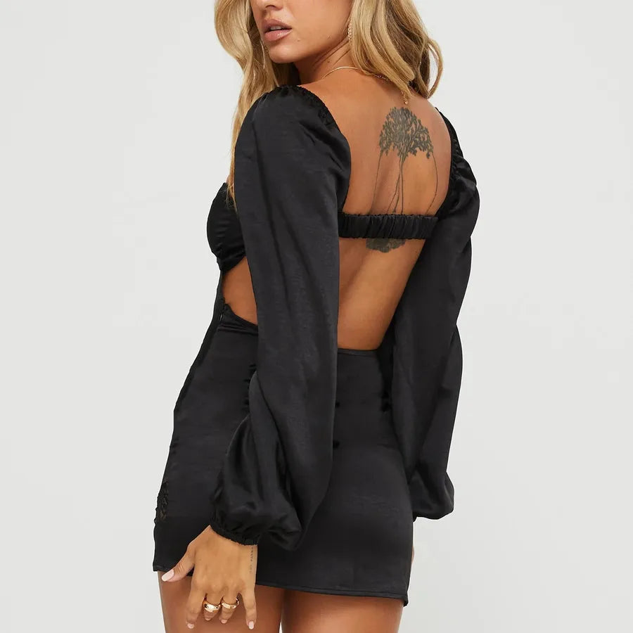 Elegant Backless Long Sleeve Women's Dress Sexy Bodycon Skirt Fashionable Style Pure Color Polyester Fabric