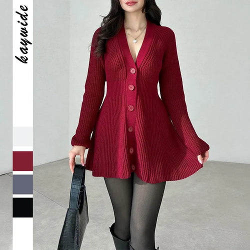 Elegant Casual Long Sleeve Knitted Dress Diyun Fashionable Autumn Women's Clothing V-neck High Waist A-line Skirt Dress