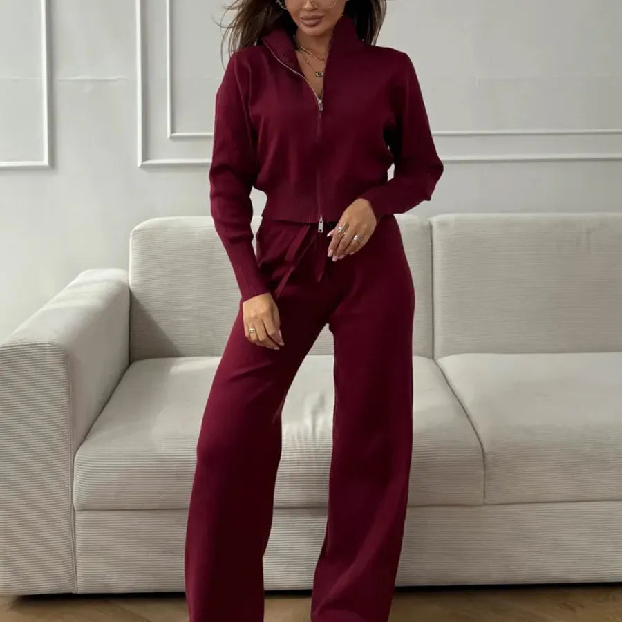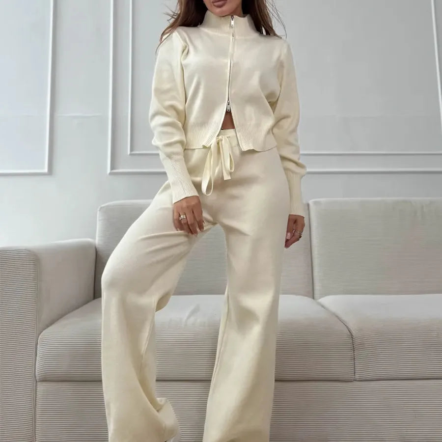 Elegant Commuter Zipper Knitted Suit Autumn Winter New Style Slim Fit Sweater Set Pure Color Casual Fashion European American Style