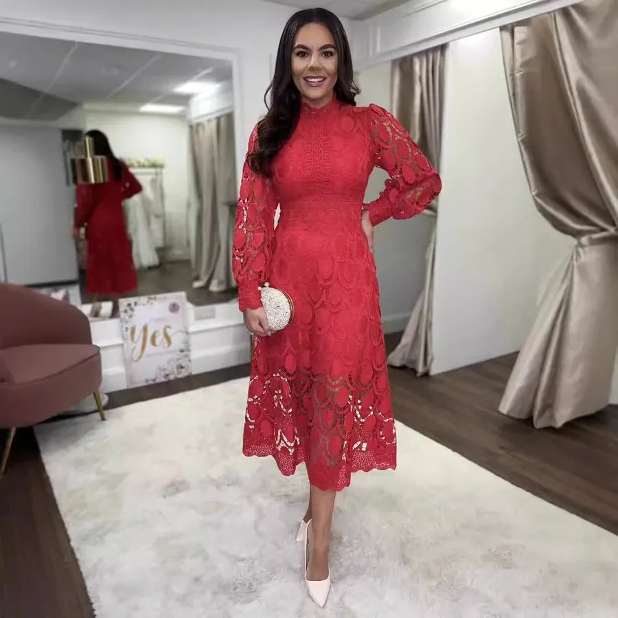 Elegant European Style Long Sleeve Hollow Out Lace Trim Dress Stand Collar Full Skirt Commute Suitable Polyester Fabric Dress