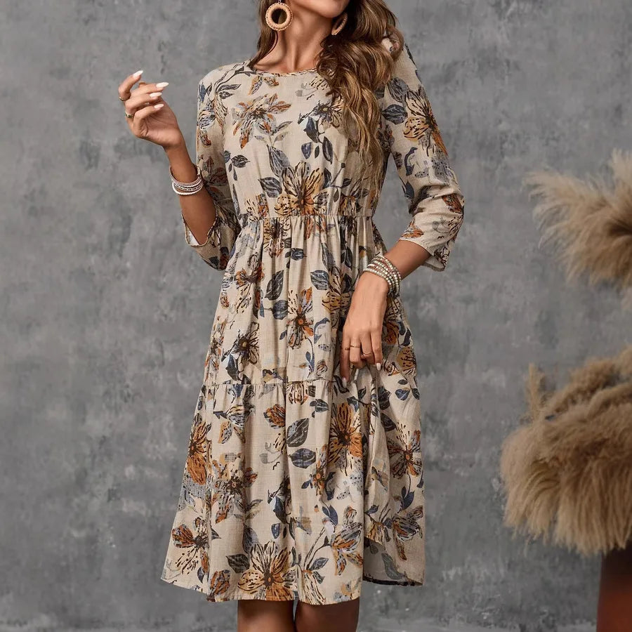 Elegant Fashionable Women's Cotton Linen Print Dress Round Neck 3/4 Sleeve Casual Style A-Line Long Dress Floral Pattern