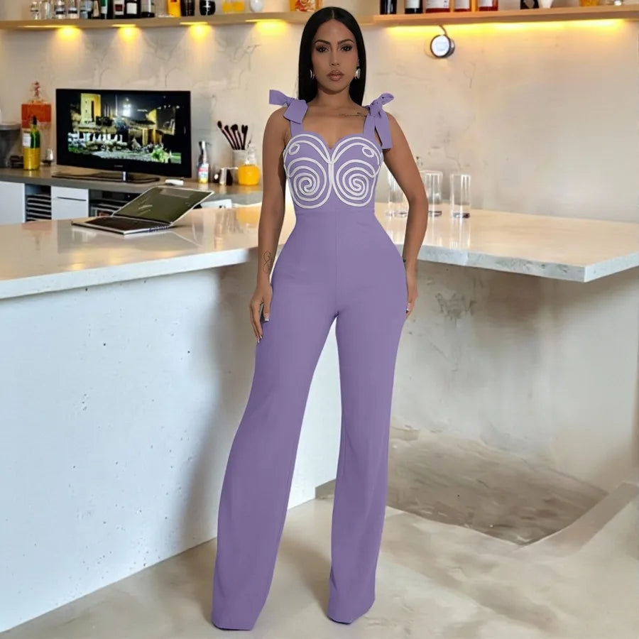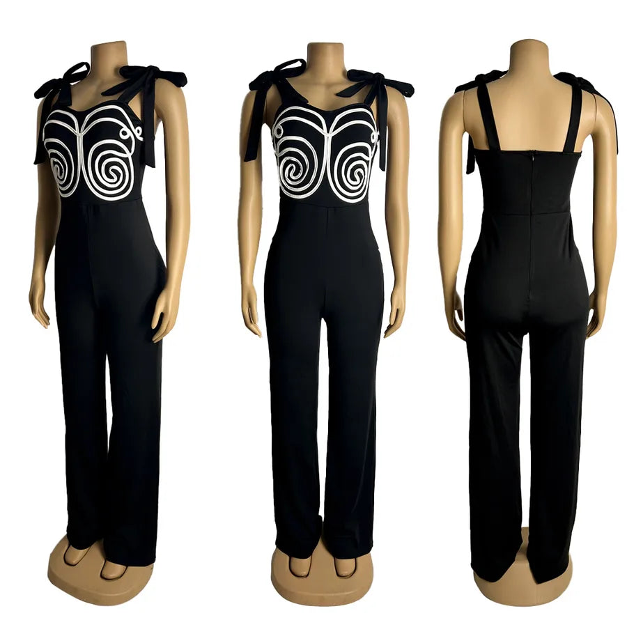 Elegant Geometric Embroidered Design Jumpsuit ZY6252 For Women High Elasticity Knitted Fabric No Sleeve Long Pants Party Wear