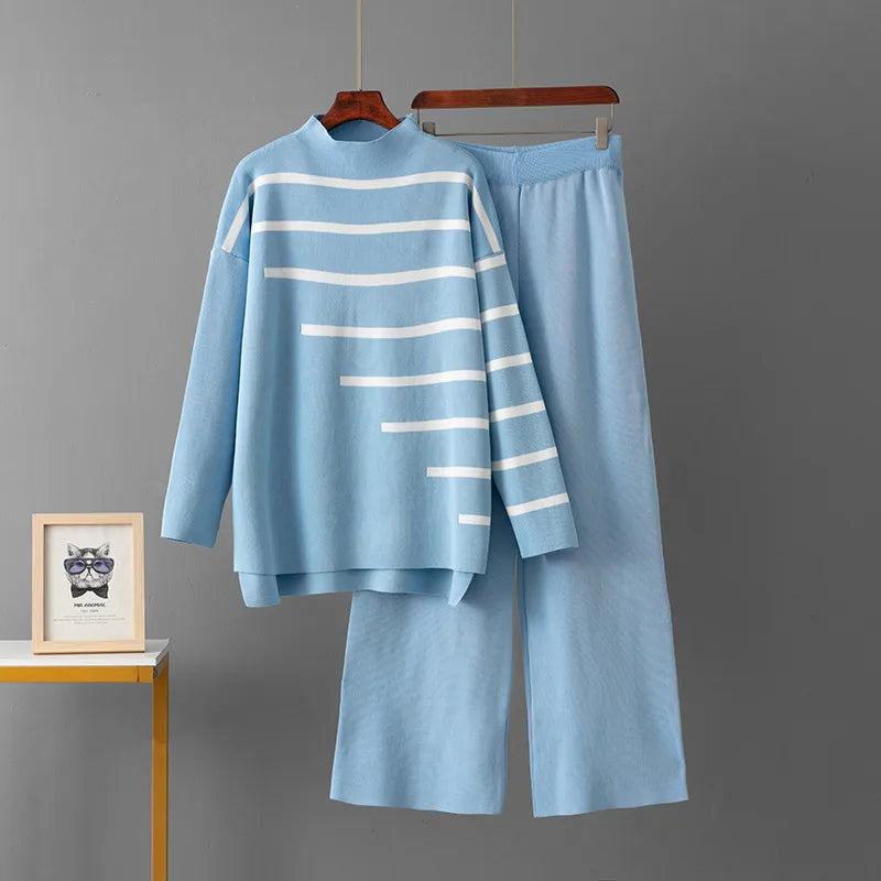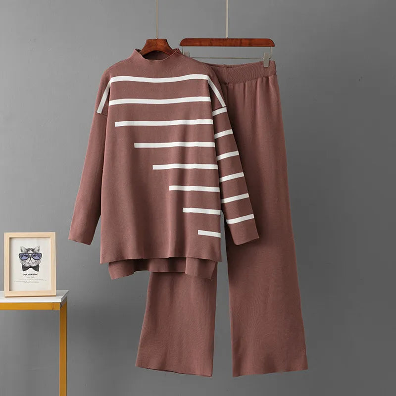 Elegant Knitted Stripe Two-Piece Set High Neck Loose Casual Long Sleeve Women's Fashion Commute Style Sweater And Pants Ensemble