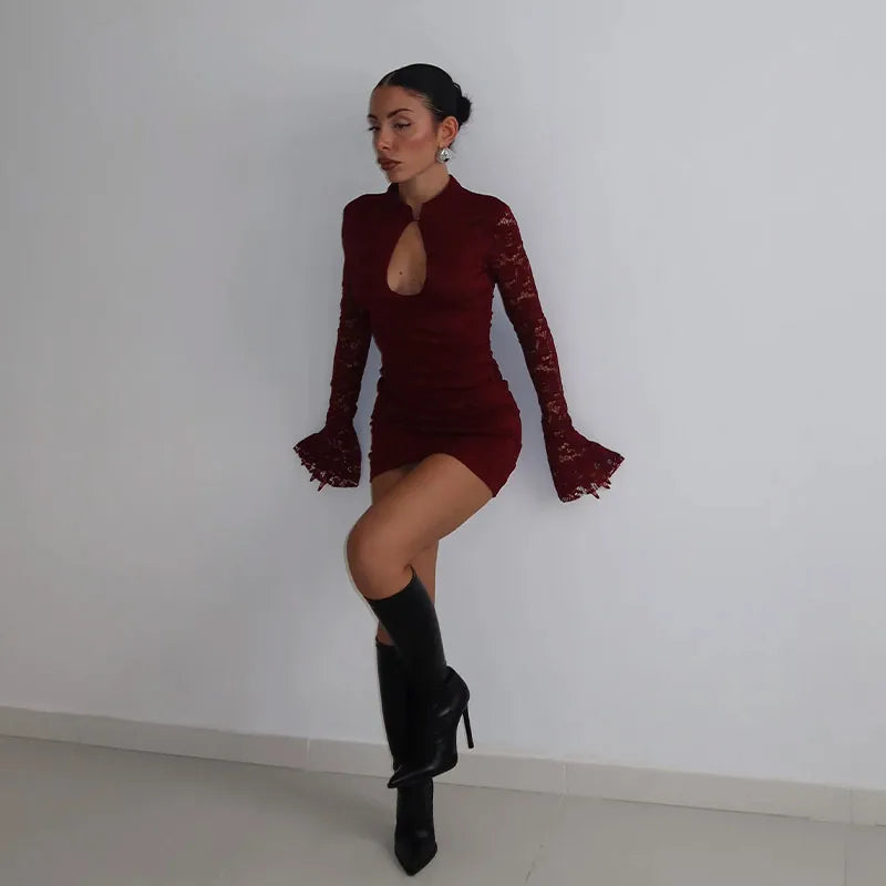 Elegant Lace Bodycon Dress Button Collar Fashionable European Style Women's Qipao Dress Sexy Long Sleeve Pure Color Gown