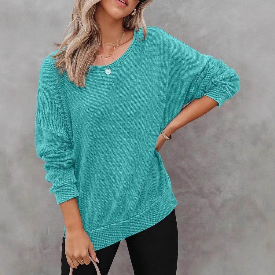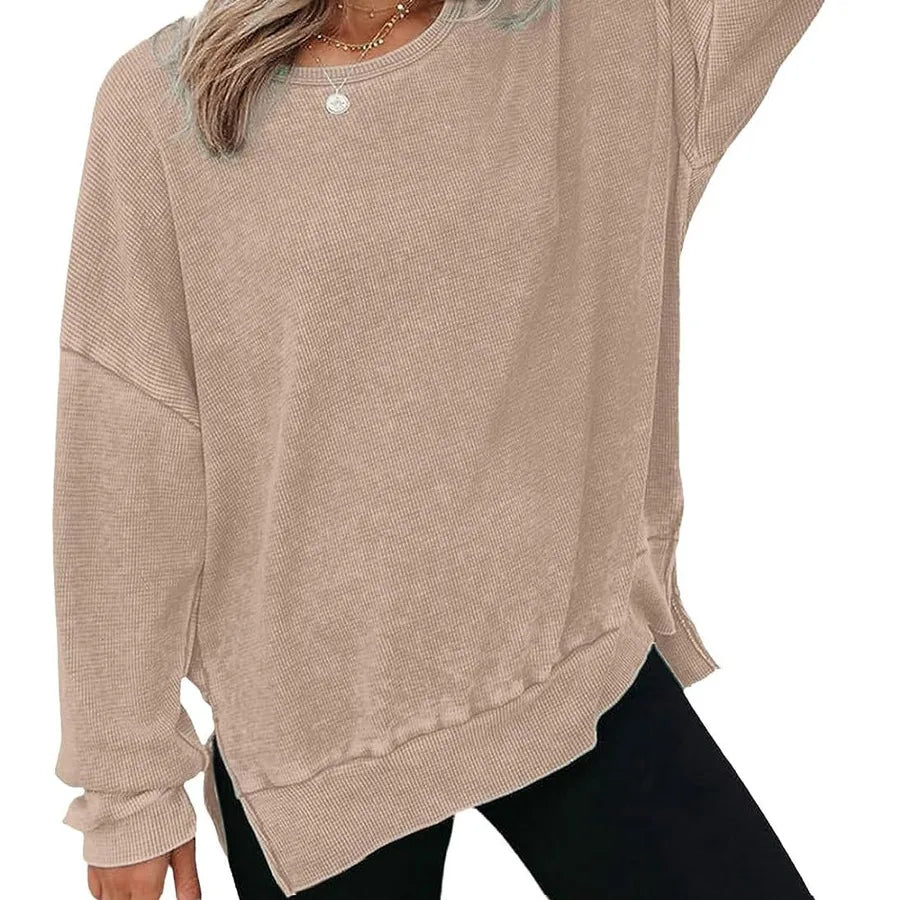 Elegant Long Sleeve Round Neck Women's T-shirt European Style Autumn New Side Slit Waffle Pattern Sweatshirt Comfortable Fit