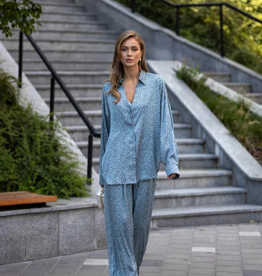 Elegant Printed Long Sleeve Shirt And Wide Leg Pants Fashionable Casual Outfit Set Draping Sensation Commute Inspired Style