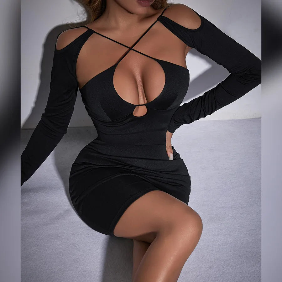 Elegant Pure Color Long Sleeve Hollow Out Back Bodycon Dress Women's Fashion Sexy European Style Autumn Winter New Arrival