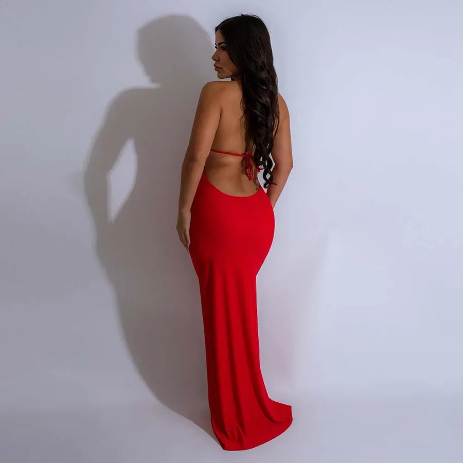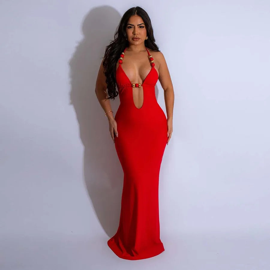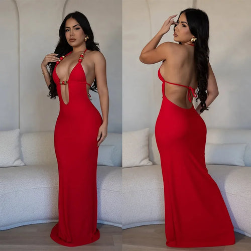 Elegant Sexy Deep V-neck Beaded Slim-fit Evening Dress Backless Strap Long Skirt European Style Pure Color Knitted Fabric