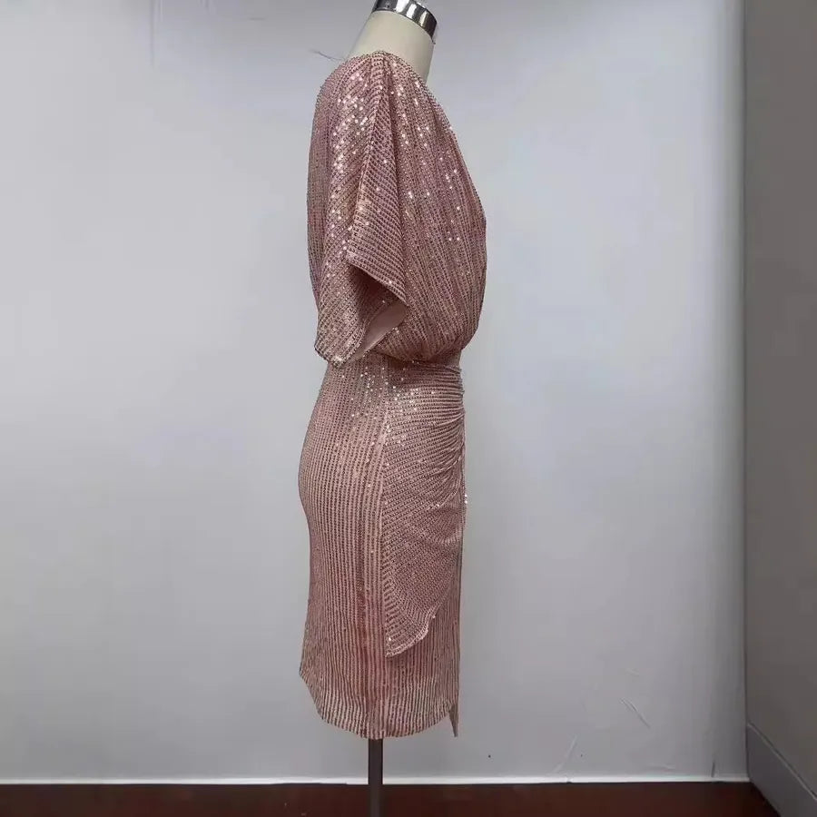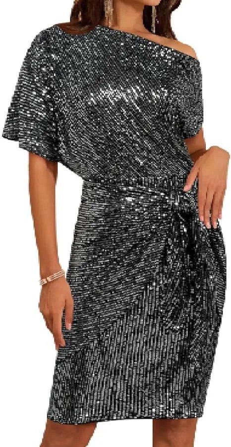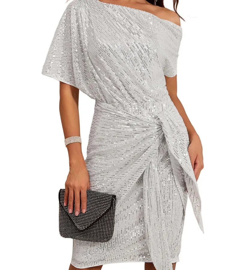 Elegant Short Sleeve Glittering Club Party Dress For Women Fashionable Chiffon Sequin Patchwork Shoulder Pleated One-step Skirt