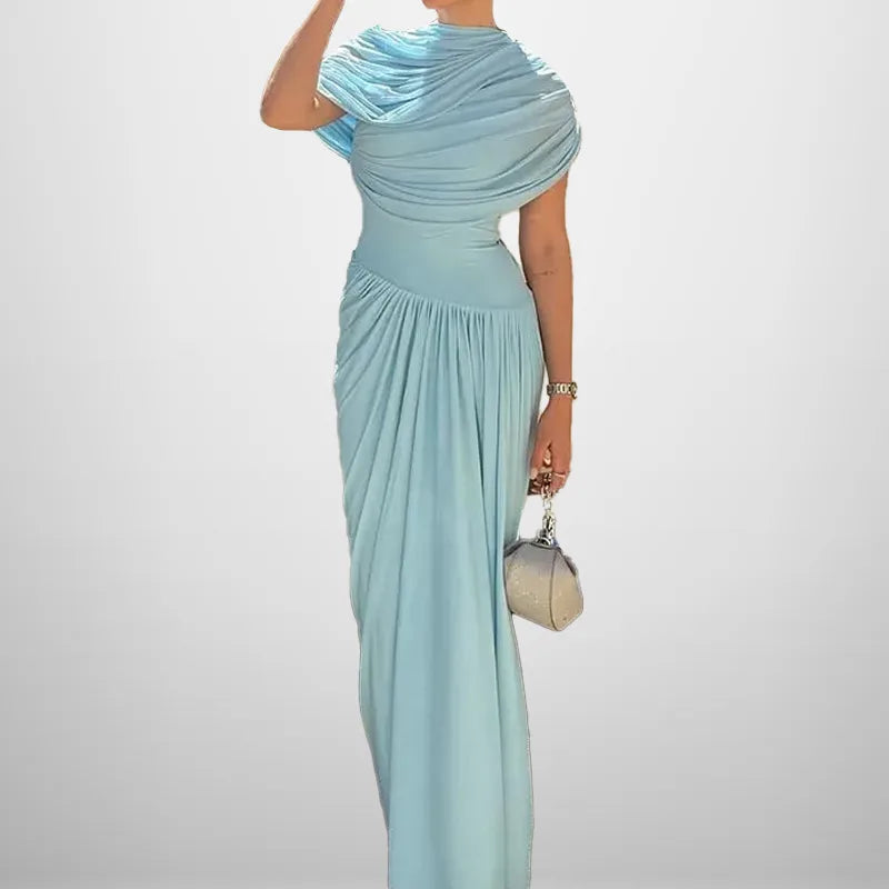 Elegant Slimming Long Dress Spring Fashion Pleated Waist-Cinching Midi Skirt Polyester Fabric Round Neck Short Sleeve