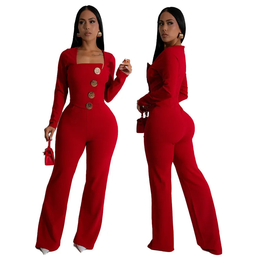 Elegant Style Women's Jumpsuit With Long Sleeves And Buttons Long Pants Autumn Winter Fashion Design