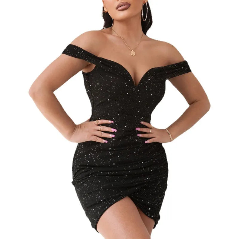Elegant V-Neck One Shoulder Short Skirt Women's Dress Sexy Split High-End Party Gown Bodycon Summer Fashion Trend Color Solid