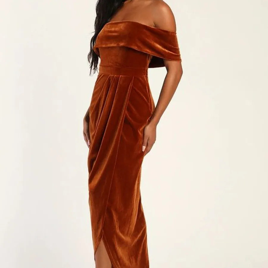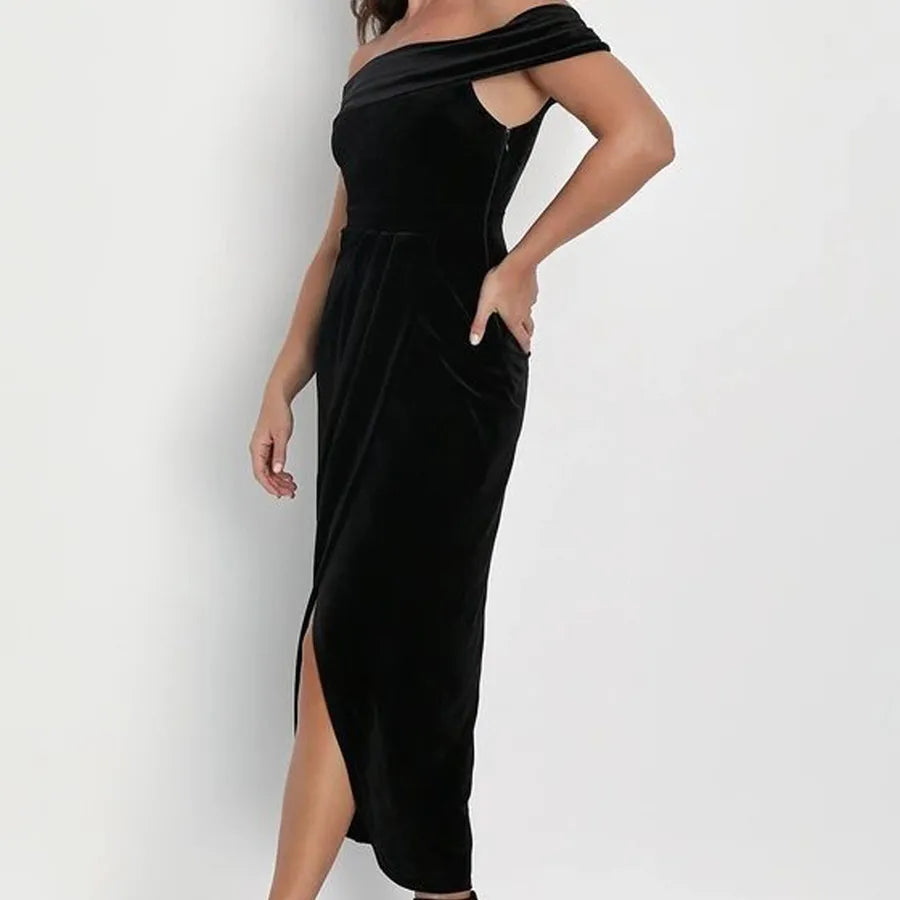 Elegant Velvet Dress One Shoulder Slit Style Short Sleeve Zipper Patchwork Commute Dress Pure Color